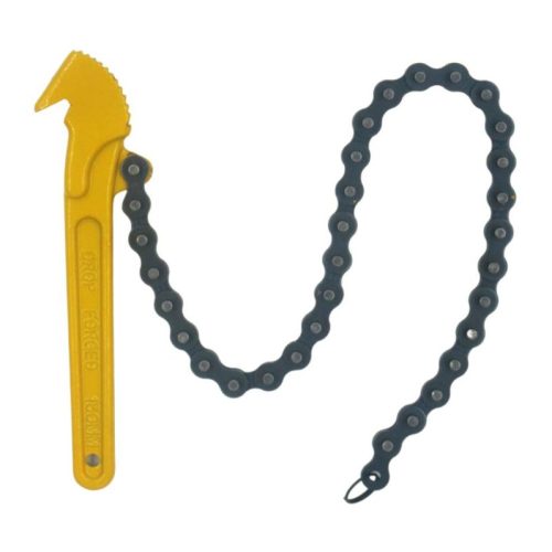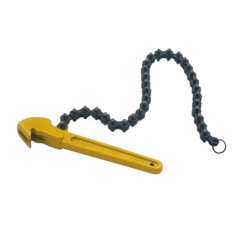 Drop forged from vanadium alloy steel with a chain made of nickelchrome molybdenum steel. Will fit to objects of any shape : round, square, hexagon, etc. Can be used in close quarters where it would be difficult to use a pipe or wrench. This wrench has ratchet action which enables it to tighten and free up without being removed from the pipe.